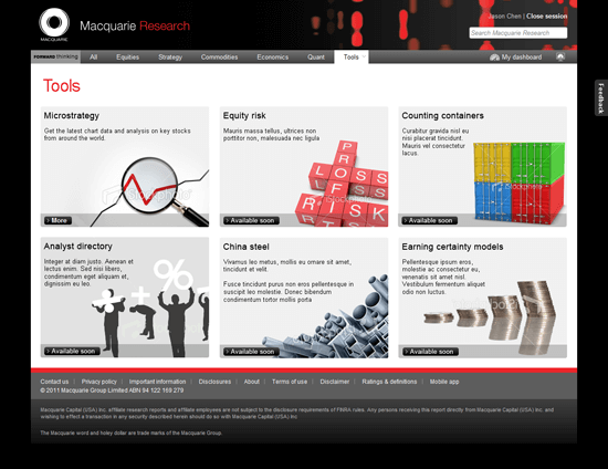 Macquarie research was a large subscriber web portal containing financial analysis content. I assisted in the re-design and implementation to improve the user experience of the existing portal for subscribers.